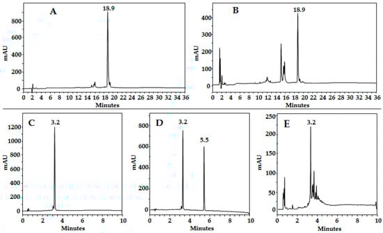 Stability of peptides derived from SPINNTKPHEAR. Chromatographic profile of peptide HPV-1 ((A), tR: 18.9 min); (B) HPV-1 mixed with cysteine solution and lyofilized; (C) peptide HPV-5 C–Ahx–SPINNTKPHEAR; (D) HPV-5 (tR: 3.2 min) mixed with free Ferrocenecarboxylic acid (tR: 5.5 min), reaction time 0 h and (E) 24 h.
