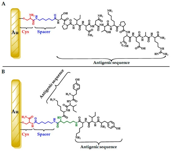 The development of biosensors applied to clinical tests has been directed towards the search for high-performance systems with further integration and miniaturization, approaching the molecular level. Biosensors compared with conventional methods have several potential advantages, such as (i) a less traumatic procedure; (ii) increased test speed; (iii) the possibility of miniaturization; (iv) versatility for application in rural regions; and (v) reduced testing costs []. The use of biosensors for the diagnosis of HPV infection is a research field that is in an early stage. Recently, it has been demonstrated that the immobilized peptide derived from HPV-16-L1 on a glassy carbon electrode detects antibodies generated against HPV-16. The antigen–antibody complex induces a current drop in the square wave voltammetry signal []. Peptides can be used for generating self-assembled monolayers (SAMs) over gold surfaces [], allowing one to take advantage of specific molecular recognition, such as an antibody–antigen [,] with biological and analytical interest, with multiple applications in different fields, such as clinical, industrial, and environmental analysis, among others [,]. Peptides can be physically adsorbed (trapped into membranes, electrostatically adsorbed, adsorbed through hydrophobic interactions, etc.) on different electrode surfaces, but it is not an affinity interaction. In this context, we previously designed a bioelectrochemical immunosensor; specifically, the synthetic peptide HPV-1: Fc–Ahx–SPINNTKPHEAR was physically immobilized on a gold electrode, and the coating was done through the drop-casting method, using the Nafion polymer. HPV-1 was designed containing a ferrocene probe, a spacer, and a sequence derived from L1-HPV protein []. The electrochemical behavior of the modified electrode was examined via cyclic voltammetry in order to evaluate the redox behavior of the ferrocene moiety. Changes in such behavior upon addition of the serum samples suggested that the fabricated bioelectrochemical sensor was able to recognize the interaction between antipeptide antibodies and the immobilized HPV-1 peptide with high selectivity and sensitivity.