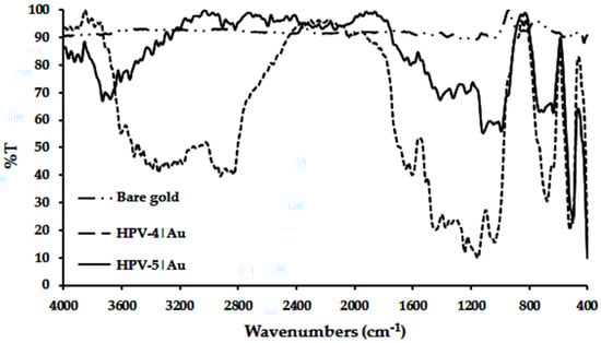 FT-IR spectrum of HPV-4|Au, HPV-5|Au and bare Au electrodes at an incident ray angle of 60°.