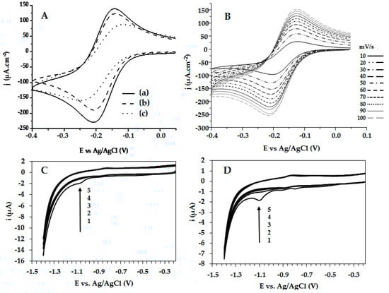 The electrodes were also electrochemically characterized before and after modification by cyclic voltammetry. The conventional three-electrode system was used to determine the effect of working electrode surface modification. The electrochemical behavior observed in a solution of 1 mM (probe molecule, redox pair ) in 0.5 M potassium chloride (KCl) as a supporting electrolyte was recorded at 80 mV/s. Measurements were made between the potential at zero current and −0.4 V. For the bare electrode (Figure 5A, curve a), a typical reversible cyclic voltammogram was found. The active area (Aact) for the bare electrode was 0.0240 cm2; the real surface area (Areal) was calculated from the charge required to form an AuO monolayer, and it corresponded to 0.0257 cm2 (Supplementary Materials, Figure S2). The relationship between Areal and Aact, corresponding to the roughness factor, was 1.07. This value indicates that the bare Au electrode was planar, without roughness.