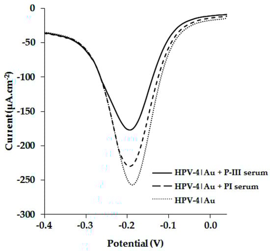 New Zealand rabbits were immunized using a polymeric peptide, CGSPINNTKPHEARGC, and rabbit sera were evaluated by ELISA; the post III serum specifically recognized peptide HPV-4 with a 1:25,600 dilution. Through the use of the square-wave voltammetry (SWV) technique, we compared the behavior of the HPV-4|Au electrode in the presence of preimmune (PI) or post-III (PIII) sera. The results showed that it was possible to observe the antigen–antibody interaction (Figure 6). The antigen–antibody complex formation induces a significant current drop compared with the HPV-4|Au electrode, in the presence or absence of PI serum. Our results suggest that HPV-4|Au and HPV-5|Au surfaces could be useful to develop electrochemical detectors for recognizing antibodies from sera of patients with HPV infection.