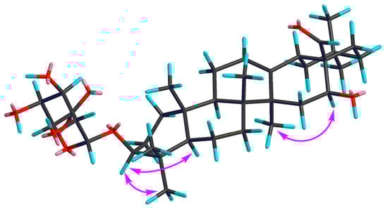 Compound 1 was obtained as a pale yellow powder, and was found to have the molecular formula C36H56O9, as determined through HR-ESI-MS ([M + H]+ peak at m/z 633.3998, calc. for C36H57O9, 633.4003). IR spectrum indicated hydroxyl (3393 cm−1), carbonyl (1715 cm−1) and C=C double bond (1607 cm−1) functions. The 1H-NMR spectrum (Table 1, Figure S1) displayed signals for seven methyl groups at δH 0.83, 0.88, 0.96, 0.96, 0.98, 1.08 and 1.25 (each 3H, s, H3-26, 24, 29, 30, 25, 23, 27). Further features included signals observed at δH 3.19 (1H, dd, J = 11.7, 4.3 Hz, typical for an axial proton attached to a hydroxylate carbon), δH 5.34 (1H, br t, J = 1.5 Hz, assignable to a vinylic proton), and at δH 9.76 (1H, s, an aldehyde proton signal). The 13C NMR spectrum (Table 2, Figure S2) displayed a methine carbon signal at δC 208.0 (supporting the presence of a CHO group), a quaternary carbon signal at δC 175.5 (ester carbon), and two olefinic carbon signals (one quaternary at δC 142.0 and one methine at δC 123.1, suggesting the presence of a double bond). Furthermore, the spectrum also showed a signal at δC 105.3 (CH) assignable to an anomeric carbon in a sugar unit. On the basis of these data, compound 1 was determined to be a triterpene glycoside. Its aglycone was determined to be gummosogenin [], due to their similar NMR data, except for the presence of one set of resonances attributable to a β-d-glucuronopyranosyl moiety [H-1′ (δH 4.38, 1H, d, J = 8.2 Hz), δC 74.1, 75.3, 76.6, 78.1, 105.3 and 175.5] in 1 []. Comparison of the 13C NMR data of 1 with that of gummosogenin showed the downfield shift of C-3 (+11.4 ppm) and upfield shift of C-2 (−2.6 ppm) in 1, indicating glycosylation at C-3. This assignment was further confirmed by the HMBC correlations (Figure 2, Figure S5) between H-3 (δH 3.19, 1H, dd, J = 11.7, 4.3 Hz) in the aglycon and C-1′ (δC 105.3) in β-d-glucuronopyranosyl moiety, and between H-1′ and C-3. The relative configuration of 1 was confirmed by nuclear overhauser enhancement spectroscopy (NOESY) (Figure 3, Figure S6). The α-orientation of H-3 was deduced from the correlations of H-3 with H-5 (δH 0.81, 1H, m) and H3-23 respectively. The α-orientation of H-16 (δH 4.32, 1H, dd, J = 11.9, 4.5 Hz) was deduced from the correlations of H-16 with H3-27. The structure of 1 was confirmed by a complete acid hydrolysis of the saponin mixture A, which afforded D-glucuronic acid, as identified by co-TLC with an authentic sample []. On the basis of these findings, the structure of 1 was elucidated and named ligushicoside A.