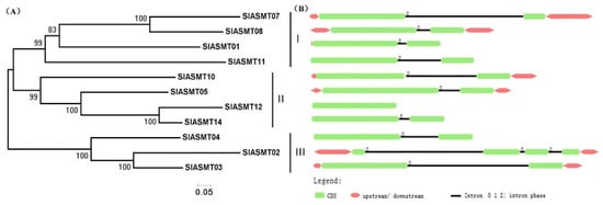 Phylogenetic analysis and intron/exon configurations of SlASMT genes in tomato plants. (A) Phylogenetic tree of the SlASMT genes was constructed using MEGA 5.0; (B) The introns and exons were drawn to scale with the full encoding regions of their respective genes. The boxes indicate the exons, and lines indicate the introns: 0 = intron phrase 0; 1 = intron phrase 1; 2 = intron phrase 2.