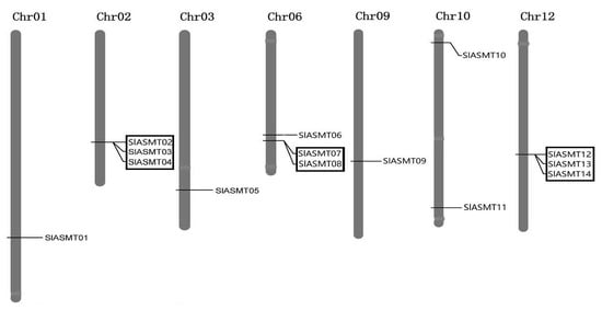 In this study, chromosomal mapping was performed to examine the genome distribution of the SlASMT genes in the tomato plants. As the results indicated, multiple genes were located on seven of the twelve chromosomes and exhibited uneven distributions (Figure 2). A maximum number of three genes was mapped on chromosomes 02, 06 and 12, while only one gene was located on chromosomes 01, 03 and 09. In contrast, chromosomes 10 contained two members (SlASMT10 and SlASMT11).