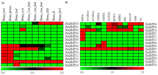 Expression profiles of SlASMT genes based on RNA-Seq in tomato plants. (A) Cultivated tomato (S. lycopersicum); (B) Wild tomato (S. pinpinellifolium); all RNA-Seq datasets were obtained from the Tomato Functional Genomics Database (http://ted.bti.cornell.edu/), and a detailed description of the samples is available from the Tomato Functional Genomics Database. Then, the log2-transformed RPKM values were used to obtain a heatmap using Multi-Experiment Viewer software. The blocks with colors indicate low (green) or high (red) transcript accumulation, relative to the respective control. MG is the mature green fruit; B represents the breaker stages (early ripening); and B10 represents the 10-day post breaker stages (red ripe).