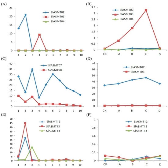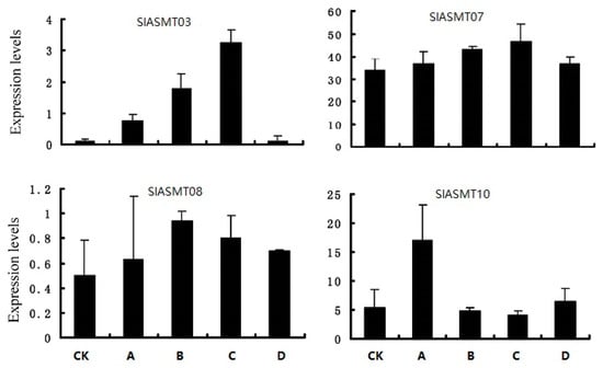 In order to investigate the possible functional differences of the SlASMT genes, their expression patterns were analyzed based on RNA-Seq and qRT-PCR technology. The results demonstrated different types of expression patterns among these SlASMTs (Figure 3 and Figure 6). Three of these genes (SlASMT08 and SlASMT10) were expressed in the buds, flowers, leaves, roots, and non-mature fruit, which suggested an important role in the vegetative growth, as well as the early stages of reproductive growth. The expression of seven of the SlASMT genes showed tissue-specific patterns, including flowers and buds (SlASMT02, SlASMT12 and SlASMT13), leaves (SlASMT14), and roots (SlASMT03). These results indicated a vital role in the growth and development of the flowers, leaves, and roots, respectively. In addition, it was also found that the SlASMT05 gene was expressed in the mature fruit, which indicated that it could potentially play vital roles in the vegetative growth, as well as the latter stages of the fruit development. Finally, the expression of the SlASMT07 gene was detected in all of the tested tissues and was involved in all growth and development stages of the tomato plants. In regards to the remaining five genes, their expressions were not detected in any of the tissues. These results suggested that the expression levels of these genes were too low to be detected in the tested tissues, or that they were not expressed to any significant degree.