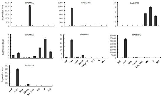 In order to confirm the results obtained by the RNA-Seq and to attempt to quantify the expression levels, qRT-PCR was performed, and the results were compared. In this study, the expressions of eleven SlASMT genes were analyzed for eight different tissues, including the roots, stems, leaves, flowers, immature green fruit, mature green fruit, breaker fruit, and 10-day fruit post breaker stages (red ripe). Among these eleven SlASMT genes, four (SlASMT01, SlASMT04, SlASMT08 and SlASMT11) were not detected in any tissues. The remaining seven genes were expressed in at least one of the tested tissues (Figure 6). However, the expression levels of these genes displayed obvious differences. Three of the genes (SlASMT02, SlASMT03 and SlASMT12) showed tissue-specific expression patterns. Of these seven SlASMTs, five were expressed in the roots, with the exception of the SlASMT02 gene, which was expressed in the flowers. SlASMT07 was ubiquitously expressed at similar levels in most of the tested organs. Additionally, the SlASMT14 gene was expressed in the leaves based on the RNA-seq method. However, in this study, it was only detected in the roots and flowers when using qRT-PCR. Overall, these results were consistent with the expression of the SlASMT genes obtained by the RNA-Seq data.