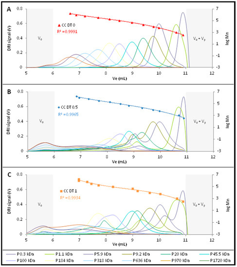 Firstly, the influence of the TBAF concentration was studied on the pullulan standards. Three calibration curves with various TBAF concentrations 0, 5 and 10 mg/mL (named respectively CC DT 0, CC DT 0.5 and CC DT 1.0) were obtained (Figure 1) by polynomial regression, with satisfying correlation coefficients (R2 > 0.99%).