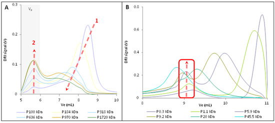 For high molecular weight pullulan samples (higher than 100 kDa), this aggregation phenomenon had a slightly different consequence. The elution peaks were flattened, widened and displaced to lower elution volume, and an exclusion peak (elution volume between 5 mL and 6 mL) appeared and increased in intensity with the increase of pullulan molecular weight as indicated by the red arrows (Figure 2A).