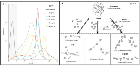 (A) Chromatograms of Avicel® samples in different TBAF/DMSO solutions (DMSO; 60 °C; 0.5 mL/min) and (B) Representation of different TBAF concentration related phenomena affecting the elution volume, among to TBAF concentration.