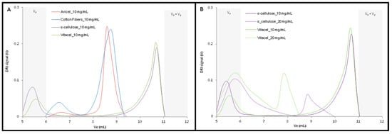 The four different cellulose samples were first dissolved into the solution of 10 mg/mL TBAF concentration. The chromatograms obtained presented two different behaviors depending on the celluloses nature (Figure 4A).