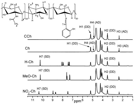 The degree of deacetylation of commercial chitosan (CCh) and purified chitosan (Ch) were determined from 1H-NMR spectra (Figure 1) as 90.1% and 90.4%, respectively. These values were determined from the ratio of areas of the hydrogen bonded to carbon 2 in the pyranose ring related to signals at 3.5 ppm (H2) and the signal in the region of 2.3 ppm (H3) attributed to the acetamido methyl hydrogens [24]. The degree of substitution for biopolymeric Schiff bases formed with salicylaldehyde and 5-methoxy and 5-nitro-salicylaldehyde derivatives were calculated from the ratio between the integrated resonances of the hydrogen at carbon 7 (H7) in the imine groups at 10.3 ppm and the hydrogen at carbon 2 in the glucopyranoside ring in the region of 2.4 ppm (H2). The for salicylaldehyde chitosan (H–Ch), 5-methoxy-salicylaldehyde chitosan (MeO–Ch) and 5-nitro-salicylaldehyde chitosan (NO2–Ch) were 51.2%, 54.3% and 48.0%, respectively. The hydrogen assignments are shown in Figure 1.