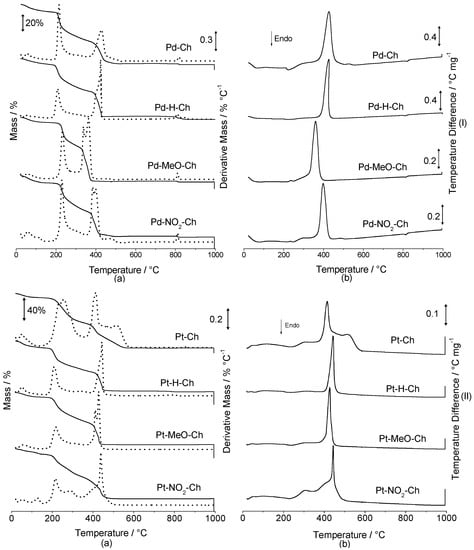 TGA/DTG (a) and DTA (b) curves of palladium complexes (I) Pd–Ch, Pd–H–Ch, Pd–MeO–Ch, Pd–NO2–Ch and platinum complex (II) Pt–Ch, Pt–H–Ch, Pt–MeO–Ch, Pt–NO2–Ch, both under an air atmosphere, heating rate of 10 °C min−1, air flow rate 100 mL min−1, sample mass 6 mg ± 0.1, α-alumina sample holder.