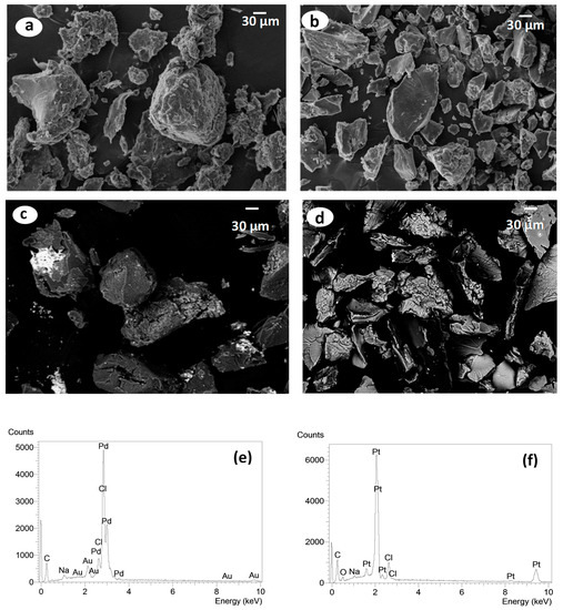 Scanning electron microscopy (SEM) pictures of (a) Ch; (b) H–Ch; (c) Pd–H–Ch; (d) Pt–H–Ch and X-ray energy-dispersive analysis (EDS) spectra of bright spots (e) Pd–H–Ch and (f) Pt–H–Ch.