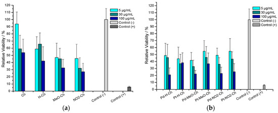The in vitro cytotoxicity effects of chitosan, Schiff bases and Pd(II), Pt(II) complexes were evaluated against breast cancer cells using the MTT assay. Results showed that for all the test compounds, the relative viability of the cells decreased with an increase in the concentration of the compound. In Figure 5a, chitosan Schiff bases showed higher antitumor activity, with cell viability ranging from 30% to 70%, compared to nonmodified chitosan, which showed a cell viability higher than 70% at all tested concentrations. Moreover, it was observed that the percentage of cell viability decreased (higher to lower cell viability) in the order of Ch > H–Ch > MeO–Ch > NO2–Ch. Results of the MTT assay for Pd(II) and Pt(II) complexes revealed a slight decrease in the viability of MCF-7 cells after 24 h compared to cells treated with the free Schiff bases (Figure 5b). One explanation could be that the square planar geometry of the Pd(II) and Pt(II) complexes allows them to interact with the secondary structure of DNA, potentially even inhibiting the replication of DNA [43]. Moreover, it has been reported that the antitumor activity of such complexes probably involves the inhibition of ribonucleotide reductase, which converts ribonucleotides to deoxyribonucleotides, leading to changes in genetic material [44].