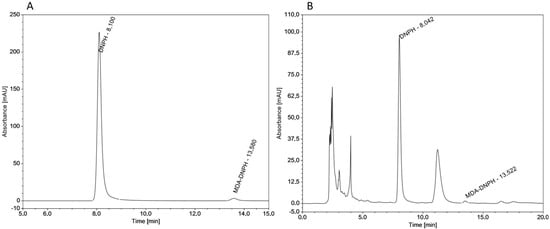 Chromatograms for derivatized MDA-DNPH (A) in standard at a concentration of 430 ng/mL and frankfurters (high-pressure MDCM) B (B).