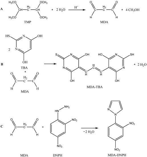 (A) The preparation of MDA by acidic hydrolysis of TMP; (B) the proposed structure of TBA pigment as a colored adduct between TBA and malondialdehyde, MDA-TBA; and (C) the formation of the DNPH derivate of MDA, MDA-DNPH.