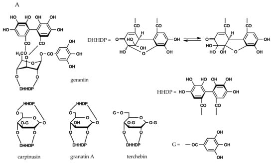 Chemical structures of ellagitannins. (A) Dehydroellagitannins and (B) C-glycosidic members (DHHDP = dehydrohexahydroxydiphenoyl; HHDP = hexahydroxydiphenoyl).