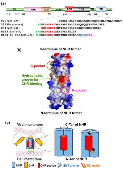 Among the 35 anti-HIV drugs, only two HIV-1 entry inhibitor-based anti-HIV drugs, enfuvirtide (T20 peptide) and maraviroc (CCR5 antagonist), can block HIV-1 fusion with and entry into the target cell. During the process of HIV type 1 (HIV-1) entry into the target cells, the viral envelope glycoprotein (Env) surface subunit gp120 binds to receptor CD4 and co-receptor (CCR5 or CXCR4) on the target cell. After that, the C-terminal heptad repeat (CHR) of the HIV-1 Env transmembrane subunit gp41 interacts with the gp41 N-terminal heptad repeat (NHR) to form the six-helix bundle (6-HB), in which three NHRs form a trimer core and three CHRs bind to the hydrophobic grooves on the trimer surface in an antiparallel way [8,9]. The 6-HB pulls the membranes of HIV-1 and target cell together for fusion. Maraviroc can block HIV-1 binding to the cellular co-receptor CCR5, while T20 can bind to the gp41 NHR trimer to block the formation of 6-HB. However, the clinical application of these two entry inhibitors is limited because both can induce drug-resistant mutants in the treated HIV/AIDS patients [10,11]. For example, HIV-1 strains with mutations at the inhibitor-binding sites in the gp41 NHR region, such as the GIV motif and the hydrophobic pocket formed by Gly547-Leu556, became resistant to T20 and other CHR peptides [12,13,14,15,16,17,18]. The next-generation peptidic fusion inhibitors with significantly improved anti-HIV-1 activities, including sifuvirtide (SFT) [19], TRI-1144 (T2635) [20], and HP23, the shortest (23 residues) CHR peptide with potent HIV fusion inhibitory activity [21], also induced drug resistance in vitro [22,23,24,25,26]. Therefore, developing novel HIV fusion inhibitors with higher genetic barriers to resistance still remains urgent.