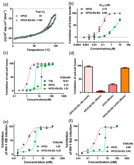 Inhibitory activity of HP23-E6-IDL. (a) Comparison of melting curves of the complexes formed by N46 and HP23 or HP23-E6-IDL. HP23-E6-IDL shows better thermostability; (b) Inhibitory activities of HP23 and HP23-E6-IDL against 6-HB formation between N46 and C34; (c) Inhibitory activities of peptides against cell–cell fusion between H9/HIV-1IIIB cells and MT-2 cells; (d) An HIV-1 Env-mediated cell–cell fusion washout assay was performed to determine the Env engagement of CD4-receptor in the HP23-E6-IDL-mediated inhibition of HIV-1 entry. Inhibition rates were as follows: HP23-E6-IDL alone without wash, 95.8%; HP23-E6-IDL alone with wash, 4.6%; sCD4 alone with wash, 28.9%; HP23-E6-IDL and sCD4 with wash, 91.1%; (e) Inhibitory activities of HP23 and HP23-E6-IDL against HIV-1 IIIB (X4 virus) infection; (f) Inhibitory activities of HP23 and HP23-E6-IDL against HIV-1 Bal (R5 virus) infection. Error bars in this figure show standard deviations.