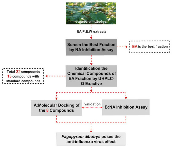 The Q-Exactive system with the its high resolving power performance easily combines with ultra-high performance liquid chromatography (UHPLC). UHPLC-Q-Exactive Orbitrap high resolution mass spectrometry (HRMS) can rapidly detect hundreds of components in complex compound mixtures from plants with short running times [9]. Similarly, molecular docking is a reliable and efficient tool for discovering or designing novel drugs used to screen biological chemical compounds [10,11,12,13]. In the present work (see Figure 1 for a flowchart of the protocol used), four F. dibotrys extracts (ethyl acetate (EA), petroleum ether (P), ethanol (E), and water (W)) were explored in a neuraminidase (NA) activity assay, with the components of the best extract being further identified by UHPLC-Q-Exactive Orbitrap HRMS. To further validate the NA inhibitory activity of F. dibotrys, eight components were docked to the NA inhibition target using molecular docking technology and tested in NA inhibition experiments. Based on the theory that NA is an important target to screen the anti-influenza virus drugs due to the fact it has the essential enzyme activity for virus replication and NA inhibitors are recognized as an effective drugs against influenza A and B by the World Health Organization [14], this research will provide a new direction and basic information for novel anti-influenza virus drug discovery.