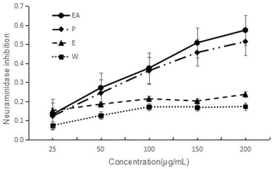 NA has been considered as an important target to screen anti-influenza virus drugs. NA inhibitory activities of the four extracts are shown in Figure 2. They all indicated dose-dependent activity. The lower IC50 value implies a higher activity. Based on the IC50 values, two extracts are good and EA is the best one. The IC50 of EA and P are 149 and 182 µg/mL, respectively. The activity order is EA > P > E > W.