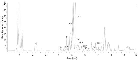 UHPLC analysis was performed using an Ultimate 3000 system (Dionex, Sunnyvale, CA, USA), connected to an online vacuum degasser, an autosampler, a quaternary pump, and a thermostatted column compartment. The chromatographic separation column was ACQUITY UPLC HSS T3, 2.1 mm × 100 mm, 1.7 µm (Waters, Milford, MA, USA) at 40 °C. The separation conditions contain a gradient elution using acetonitrile as phase A and aqueous formic acid 0.1% (v/v) as mobile phase B at a flow rate of 0.3 mL/min. The following gradient was applied: 0–1 min, 0% A; 1–10 min, 0–100% A; 10–10.1 min, 100–0% A and 10–10.1 min, 0% A. The injection volume was 2 µL, and the injection temperature was 15 °C.