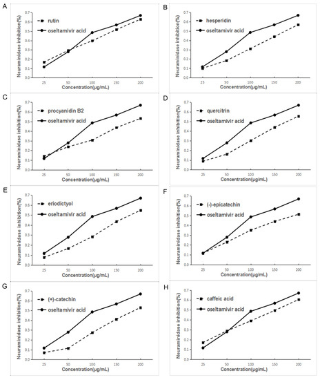 Inhibition of NA activity by various components of EA extract of F. dibotrys. ((A), rutin; (B), hesperidin; (C), procyanidin B2; (D), quercitrin; (E), eriodictyol; (F), (−)-epicatechin; (G), (+)-catechin; (H), caffeic acid).