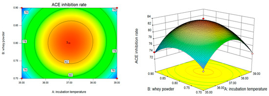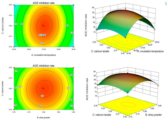 Two-dimensional contours revealed that ACE inhibition rate changed with the changes of temperature, whey powder, and calcium lactate and their corresponding three-dimensional response surface were generated to determine the interaction of the three variables on the corresponding variables better (Figure 1). As shown in Figure 1, the contour plots seemed to be elliptical or nearly circular. It implied that AB, AC, and BC had mutual interactions for the ACE inhibition rate, while they were weak (pAB = 0.5161 > 0.05, pAC = 0.2995 > 0.05, pBC = 0.6435 > 0.05). Therefore, the effect of one factor on ACE inhibition rate was dependent on the level of another one. The quadratic main effects of incubation temperature, whey powder, and calcium lactate were significant (pA2 < 0.001, pB2 = 0.0003 < 0.001, pC2 = 0.0087 < 0.01), which suggested that there was not a simple linear correlation between the variables and ACE inhibition rate.