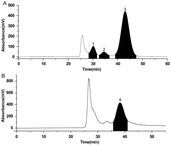 Under the optimized conditions, Figure 1A showed that S1 was successfully separated with the two-phase solvent system of ethyl acetate–n-butanol–water (2:1:3, v/v/v) in 50 min. In total, 4.36 mg of loganic acid (compound 1), 3.05 mg of swertiamarin (compound 2), and 35.66 mg of gentiopicroside (compound 3) were obtained from 100 mg of S1 with purities of 98.1%, 97.2% and 98.6%, respectively, as determined by HPLC (Figure 2). Figure 1B shows that S2 was also successfully separated with the two-phase solvent system of hexane-ethyl acetate-methanol-water (1:3:1:3, v/v/v/v) in about 45 min. From 100 mg of S2, 31.15 mg of trifloroside (compound 4) was obtained with 98.9% purity (Figure 3).