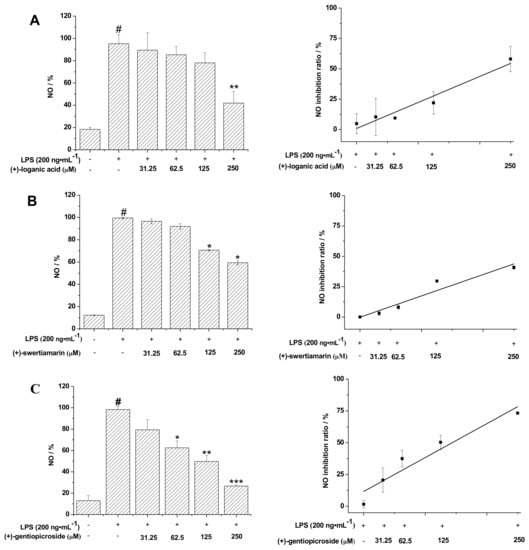 Inhibition of LPS-induced NO in microglial BV-2 cells and the NO inhibition rate of (A) loganic acid; (B) swertiamarin; (C) gentiopicroside; and (D) trifloside. BV-2 cells were treated with the indicated concentrations of (±)-glycosides and LPS (200 ng/mL) for 24 h. The NO content in the media was measured and the amount of NO in the LPS (200 ng/mL) group was set as 100%. The data is presented as the mean ± SD from three independent experiments and the differences between the mean values were assessed by the Student’s t-test: # p < 0.05 compared to the control group; * p < 0.05, ** p < 0.01, and *** p < 0.001 compared to the LPS group.