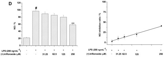 In this assay, 100 μL of supernatant media was first collected into flat black 96-well microfluor plates (Corning) after the cells had been treated with the indicated concentrations of (±)-glycosides (0, 31.25, 62.5, 125 and 250 μM) and LPS (200 ng/mL) for 24 h. Subsequently, 10 μL of the 2,3-diaminonaphthalene (0.05 mg/mL in 0.62 M HCl) was added to each well and incubated at room temperature for 15 min. Finally, the reaction was terminated by the addition of 5 μL of 3 M NaOH, and the plate was read on a SYNERGY H1 reader (BioTek Instruments Inc., Winooski, VT, USA) with the excitation at 360 nm and the emission at 430 nm refer to the report by Wang [34].