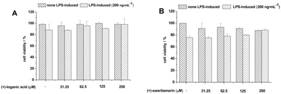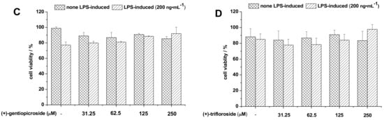 Effect of (A) longanic acid; (B) swertiamarin; (C) gentiopicroside; and (D) trifloroside on the cell viability of microglial BV-2 cells in LPS-treated or non-LPS-treated. BV-2 cells were treated with various concentrations of (±)-glycosides for 24 h and cell viabilities were monitored by crystal violet staining. Data are presented as means ± SD (n = 3 in each group).