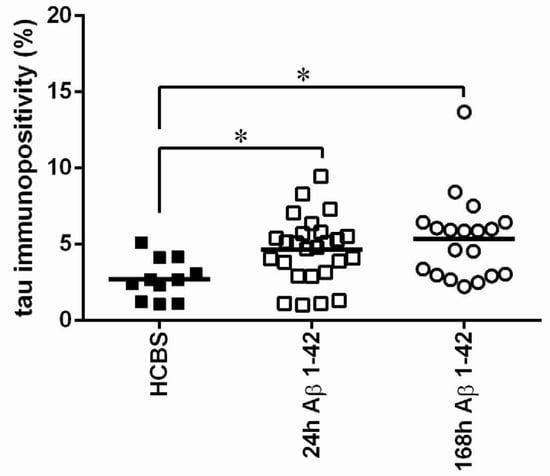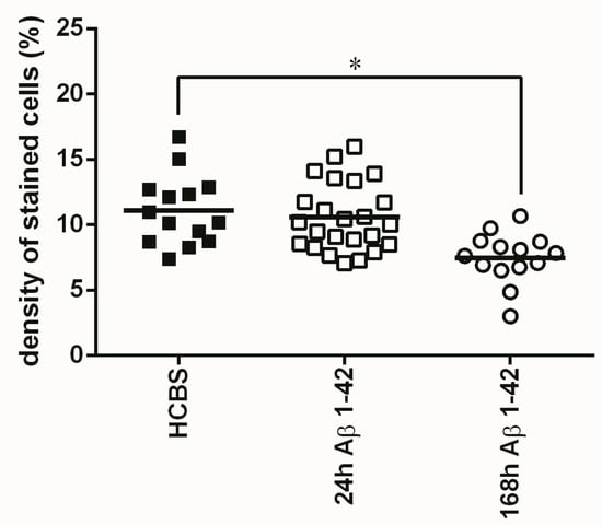 Tau-immunostaining of hippocampal slices after HCBS, 24 h aggregated and 168 h aggregated Aβ1-42 treatment (24 h/25 μM and 168 h/25 μM). Each dot represents the counted raw data, while horizontal bars indicate mean values. Significant difference in the number of tau-immunopositive cells were observed between HCBS vs. 24 h Aβ1-42 treated group and HCBS vs. 168 h Aβ1-42 treated group, (p = 0.042 and p = 0.007 respectively. n = 4, 4 slices/animal; n refers to the number of animals per group). Statistical significance was determined by one-way ANOVA, followed by Hochberg’s GT2 post hoc test. * Differences with a p-value < 0.05 were considered significant.