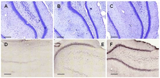 Representative coronal examples of hippocampcal sections stained with cresyl-violet (first row) to show the presence of neuron number (first row) and with tau-antibody to show the presence of abnormally aggregated NFTs (second row). (A,D): control group; (B,E): 24 h aggregated 25 μM amyloid treated group; (C,F): 168 h aggregated 25 μM amyloid treated group. Scale bar: 200 µm.