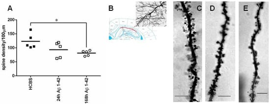 The same three groups of animals (24 h/25 μM; 168 h/25 μM oAβ1-42 and HCBS-treated control) were used as in the former experiments. We found significant differences in spine density comparing the 168 h aggregated Aβ1-42 treated to the control group. The 168 h/25 μM oAβ1-42 injected group had significantly less dendritic spines than the HCBS-treated control group (p = 0.048, Figure 6). There was no significant difference in the 24 h aggregated Aβ1-42 group compared with the controls. Representative photomicrographs demonstrated the difference between groups (Figure 6C–E, n = 2, 2–2 slices/group and 3–3 neurons per slice).