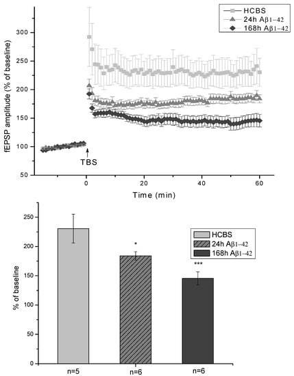 Shows the amplitude of fEPSPs normalized to pre-LTP control. The fEPSPs were recorded from the proximal stratum radiatum of CA1. The LTP of the 168 h oAβ1-42 treated animals showed robust impairment compared to HCBS treated ones, while the decrease was smaller in the group of 24 h oAβ1-42 injected rats. The histogram shows the level of LTP between 55 and 60 min post-TBS for each group. Error bars represent mean ± SEM. * p ≤ 0.05 and *** p ≤ 0.001.