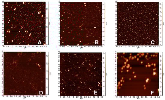 Morphology of Aβ1-42 oligomers observed on a mica surface in AFM experiments. Average heights of the aggregates after 24 h of aggregation were as follows: (A) 6.5 nm in a 25 μM solution; (B) 5.4 nm in 75 μM; (C) 10.3 nm in 200 μM. After 168 h, the following average heights were detected (D) 8.2 nm: in 25 μM; (E) 8.0 nm in 75 μM; (F) 21.5 nm in 200 μM. An elongated incubation resulted in the formation of protofibrillar aggregates besides the spherical ones, as it could be observed in images (D,E).