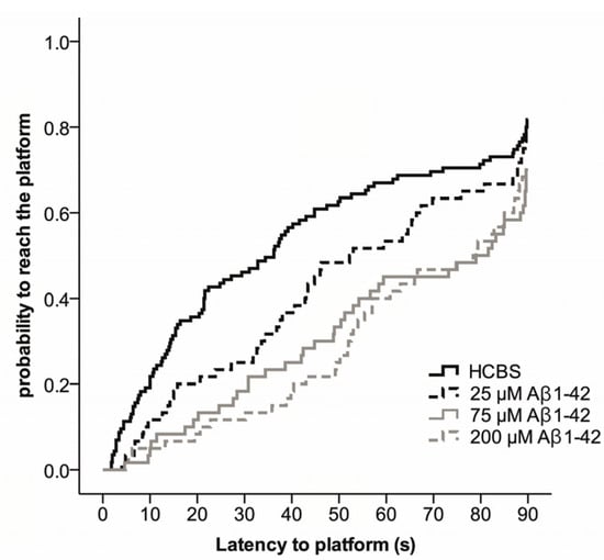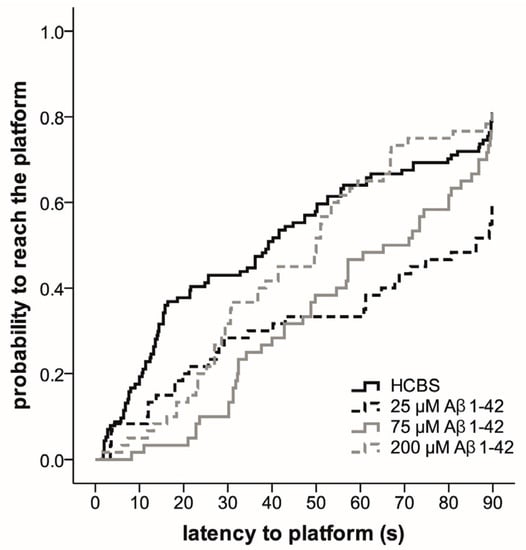 Effect of different aggregation concentrations (25, 75 and 200 µM) of synthetic Aβ1-42 (168 h time) on Morris water maze performance. The fitted survival curves using the Cox Proportional Hazard model represents the probability that animals find the platform during a trial, capped at 90 s. We compared HCBS versus 25 µM oAβ1-42 (p = 0.001), HCBS vs. 75 µM oAβ1-42 (p = 0.053), and HCBS versus 200 µM oAβ1-42 (p = 0.534) treatment groups using log-rank tests (n = 12/group, except HCBS group, where n = 23).