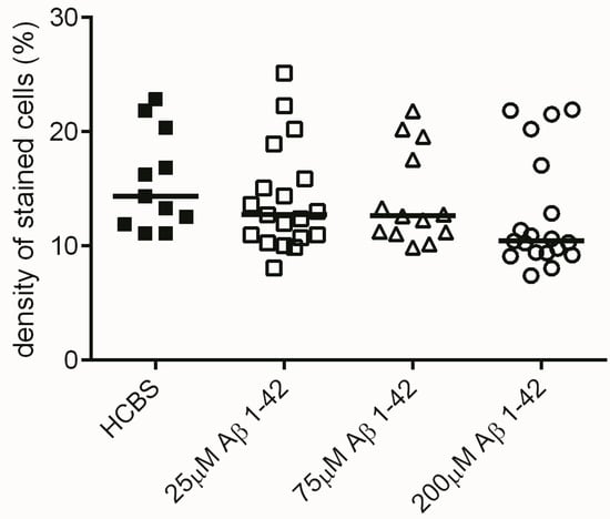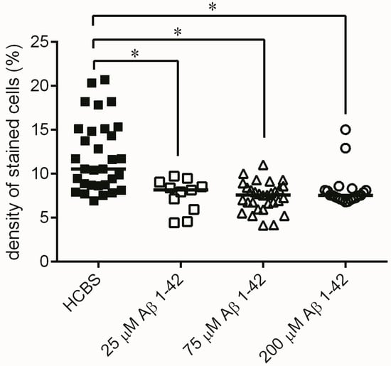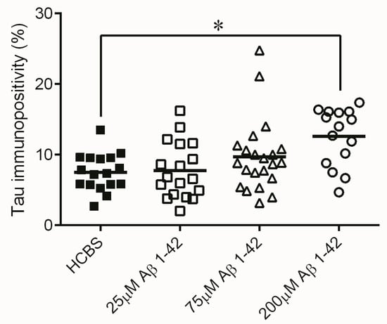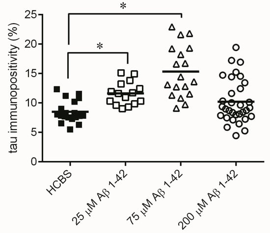 Tau-immunostaining of hippocampal slices after treatment with 24 h aggregated oAβ assemblies using increasing aggregation concentrations (25, 75 and 200 µM) of Aβ1-42 treatment. Each dot represents the counted raw data, while horizontal bars indicate mean values. Significant difference in the number of tau-immunopositive cells were observed only between the HCBS and the 200 µM Aβ1-42 treated group (p = 0.015, n = 4, 4 slices/animal; n refers to the number of animals per group) Statistical significance was determined by one-way ANOVA, followed by Hochberg’s GT2 post hoc test. * Differences with a p-value < 0.05 were considered significant.