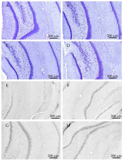 Representative examples of coronal HC sections show neurons after 25, 75 and 200 μM oAβ1-42 administration with 24 h aggregation time (Figure 15A–D) using cresyl violet staining. The abnormal aggregated NFTs are demonstrated in Figure 15E–H).