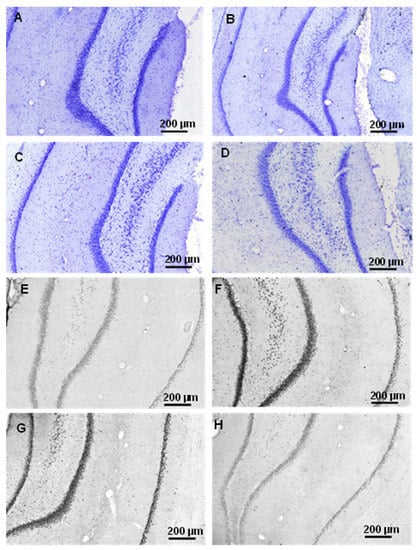 Representative examples of hippocampcal sections in 24 h aggregation groups, using cresyl-violet staining, show the change of viable neuron number (A–D). Immunochemistry with tau-antibody shows the presence of abnormally aggregated NFTs (E–H). (A,E): control group; (B,F): 25 μM concentration; (C–G): 75 μM concentration; (D–H): 200 μM concentration.