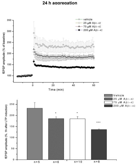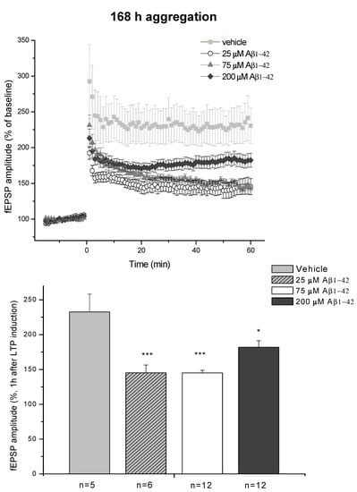 LTP impairment depends on the aggregation concentration of Aβ1-42. The effect of 168/25 μM, 168 h/75 μM and 168/200 μM oAβ1-42 samples in acute HC slices. The histogram shows the level of fEPSP potentiation between 55 and 60 min post-TBS. Error bars represent ± SEM. * p ≤ 0.05 and *** p ≤ 0.001.