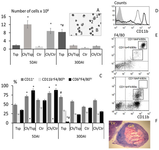 The cell response in the peritoneal cavity of mice injected intraperitoneally with chitosan and infected with T. spiralis five and 30 days after infection (DAI): (A) the number of cells; (B) the peritoneal cell glass smear from mice injected with chitosan then infected with T. spiralis (the smear being taken five days after infection). Giemsa stain; B1: macrophage, B2: neutrophil, B3: monocyte; the percentage of myeloid cell populations: (C) CD11b+ cells; CD11b+F4/80hi—resident macrophages; CD11b+F4/80lo—monocytes; (D) the number of cells identified by FACS: grey area—unstained cells, black line—after infection with T. spiralis; grey line—after injection with chitosan and T. spiralis infection on day 5; (E) representative dot plot analysis of cell populations in mice on day 5 following T. spiralis infection (upper); and in those injected with chitosan (lower); (F) hematoxylin stained cross section of liver (LV) with chitosan filled granuloma (GR). (*) p < 0.05 chitosan vs. non treated; (#) p < 0.05 infected vs. control.