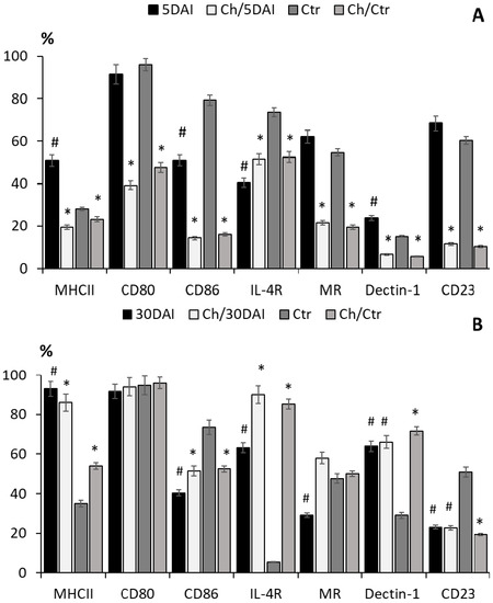 Five days post T. spiralis infection, the percentage of cells expressing MHC class II, MR, Dectin-1 or CD23 increased in untreated mice, while the percentage of cells with MHC class II, CD80, CD86, Dectin-1 or CD23 expression dramatically fell in mice treated with chitosan. Thirty days post infection, the cell populations expressing MHC class II, IL-4R and Dectin-1 were increased, but those expressing the costimulatory receptor CD86, and MR or CD23 were reduced. After a prolonged period of biodegradation, chitosan increased the proportions of IL-4R+, MR+ and Dectin-1+ cells at 30 DPI.