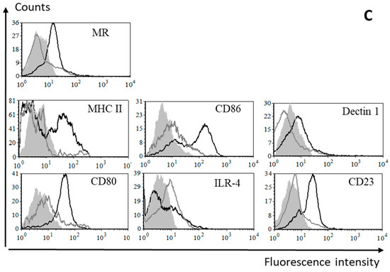 In the muscle phase of T. spiralis infection, the regulatory cell phenotype was favored, and the percentage of the CD11b+ cell population co-expressing IL-4R and MR indicated the presence of alternatively activated macrophages [32]. The macrophage marker F4/80 is also expressed at low levels on monocytes [33]. The cells were characterized as not fully activated, and the percentage expressing MHC class II, CD80, CD86, IL-4R, MR, Dectin-1 and CD23 receptors was lower. The number of myeloid cells and the level of myeloperoxidase remained temporarily elevated, but then fell as the chitosan precipitated [34].