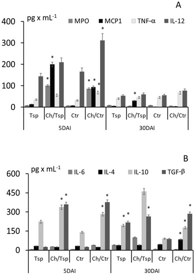 Myeloperoxidase (MPO) and cytokine response A: MCP-1, TNF-α; and B: IL-6, IL-4, IL-10, TGF-β in the peritoneal fluid of mice injected with chitosan and infected with T. spiralis: 5 and 30 DAI. (*) p < 0.05, all groups vs. control, uninfected. In the first period of treatment, chitosan supported inflammation and the response became a regulatory milieu.