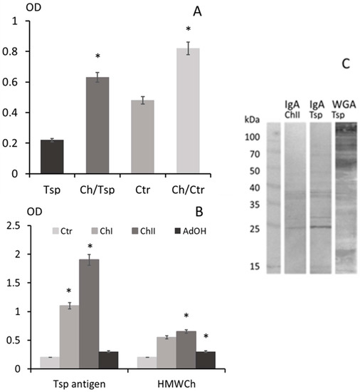 IgA response in the peritoneal cavity of T. spiralis infected mice, either with or without chitosan treatment; the level of IgA specific to muscle larvae somatic antigen identified by ELISA (A); the IgA of mice only injected with chitosan recognized T. spiralis larvae antigen and high molecular weight chitosan on a ELISA plate (B); Western-blot analysis showed that peritoneal IgA from mice injected with chitosan (ChII) and from mice infected with T. spiralis (Tsp) recognized similar glycoprotein bands on somatic larvae antigen at 30 DAI; WGA recognized GlcNAc residues between 50 kDa and 35 kDa. (*) p < 0.05 chitosan vs. non treated. The IgA induced by chitosan cross-reacted with T. spiralis muscle larvae antigens.