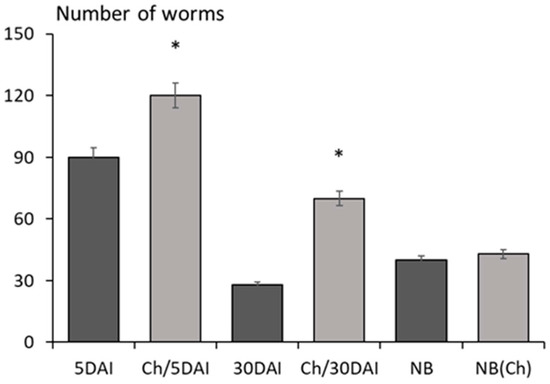 The number of adult forms in the intestine (5 DAI) and larvae × 102/g of mice muscle tissue (30 DAI) in mice infected with T. spiralis; NB: newborn larvae delivered by females isolated from control infection; NB(Ch): newborn larvae delivered by females isolated from mice infected and treated with chitosan. (*) p < 0.05, chitosan vs. infected.