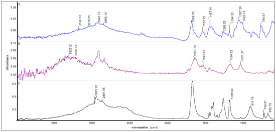 FTIR spectra of HMW chitosan: (A) dissolved in adipic acid; (B) isolated from the peritoneal cavity ten days after chitosan injection; (C) isolated from precipitated material in the granuloma 35 days after chitosan injection.